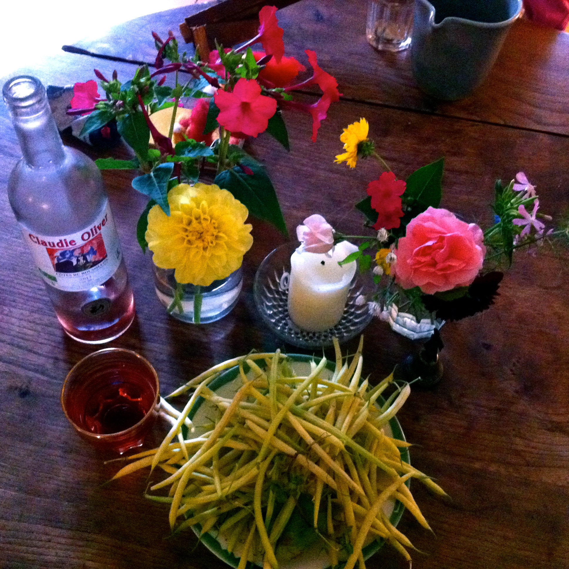 Today’s harvest: Butterbeans, beautiful flowers, water from the well and good wine.